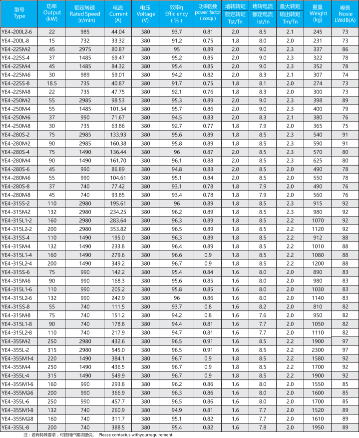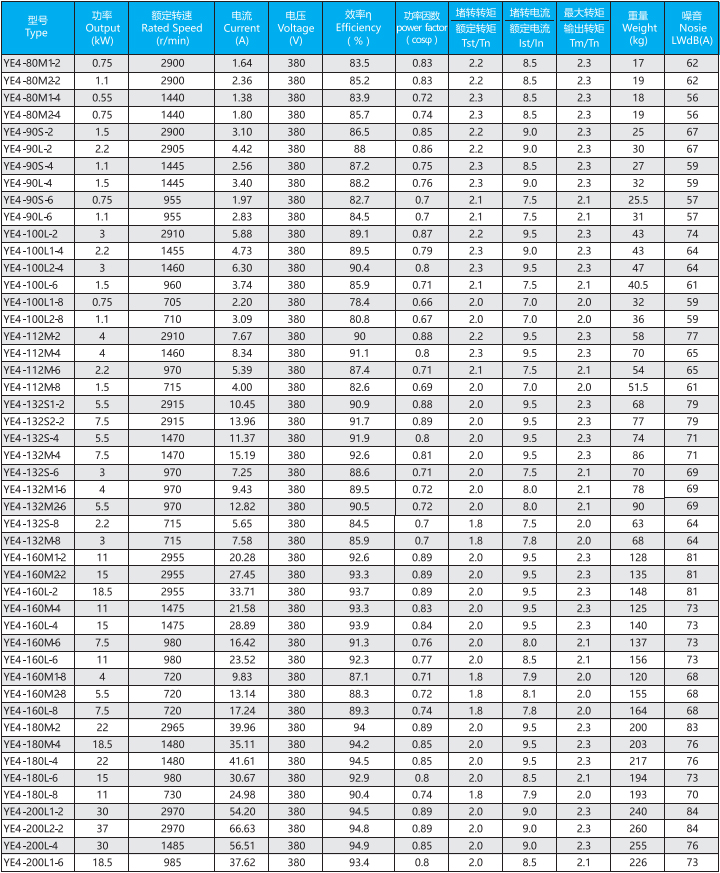 YE4系列(中心高H80-355mm、0.55-375kW)電動機是全封閉、自扇風冷式鼠籠型三相異步電動機,產品能效與IEC60034-30的IE4保持一致。一般電壓為380V、頻率為50HZ也可按客戶要求定制。工作環境-15-40℃海拔不超過1000m,絕緣等級F(B極考核)、防護等級IP55、冷卻方式IC411、工作制S1、安裝方式符合IEC和DIN標準。YE4系列電動機為一般用途的電動機,適用于驅動無特殊要求的各種機械設備。YE4系列電動機滿足GB18613-2020能效限值2級。